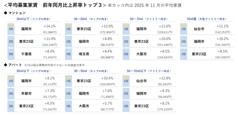 2025年は、家賃の顕著な上昇が見られた1年でもありました。単身者向けのマンションの賃料は、2025年11月までに東京23区が18ヶ月連続、大阪市が16ヶ月連続で過去最高値を更新。カップル向けやファミリー向けの賃貸住宅の家賃も、主要都市を中心に前年同月比10%前後上昇しています。